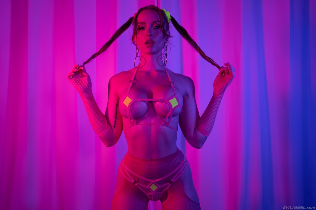 Scarlet Chase: Neon Playtime Under pink and purple neon lighting, gorgeous Scarlet Chase flaunts her beautiful face, big tits with pierced nipples and toned, heart-shaped butt. She wears pink net gloves and stockings; a tiny pink bikini; fluorescent green heels; plus glowing eye makeup. Hot Scarlet teases and twerks mesmerizingly, playing with a Hula Hoop, blowing smoke and smoke-filled bubbles! While masturbating, she pumps a thick pink dildo up her spread ass, and she tastes it. When she buries a cue ball-like toy, her stretched sphincter graphically expels it with a dollop of lube. Scarlet makes eye contact with the camera during a spit-soaked blowjob shot POV-style. She sucks Elic Chase’s boner submissively, drooling into her cleavage. Next, Scarlet impales her shaved pussy and then her asshole. A POV shot shows her split cheeks as she bounces on big cock. Giving an ass-to-mouth BJ, the naughty girl says, ‘My ass juices taste so good.’ Slobber lubes a titty fuck. More anal reaming in multiple positions comes with more A2M head. Her pink butthole gapes and leaks lube. Elic spanks the squealing girl as he buttfucks her. Playful Scarlet kneels for a cum facial. A creamy wad splatters her eye sockets and lips; semen spills from her mouth to her boobs. See also our Double Anal Rating page.